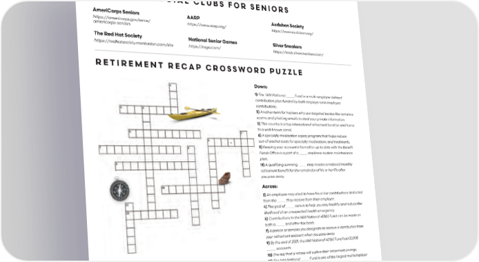DISCOVERING NEW LAND NATIONAL SOCIAL CLUBS FOR SENIORS AmeriCorps Seniors AARP Audubon Society https://americorps.gov/serve/ https://www.aarp.org/ https://www.audubon.org/ americorps-seniors The Red Hat Society National Senior Games Silver Sneakers https://redhatsociety.montonton.com/site https://nsga.com/ https://tools.silversneakers.com/ RETIREMENT RECAP CROSSWORD PUZZLE Down: 1) The IAM National _____ Fund is a multi-employer defined contribution plan funded by both employer and employee contributions. 3) Another term for hackers who use targeted tactics like romance scams and phishing emails to steal your private information. 5) This country is a top international retirement location and home to a well-known canal. 6) A specialty medication copay program that helps reduce - out-of-pocket costs for specialty medications and treatments. 8) Keeping your account information up to date with the Benefit Funds Office is a part of a _____ readiness routine maintenance plan. 11) A qualifying surviving _____ may receive a reduced monthly retirement benefit for the remainder of his or her life after you pass away. Across: 2) An employee may elect to have his or her contributions deducted from the _____ they receive from their employer. 4) The goal of _____ care is to help you stay healthy and reduce the likelihood of an unexpected health emergency. 6) Contributions to the IAM National 401(k) Fund can be made on both a _____ and after-tax basis. 7) A person or persons you designate to receive a distribution from your retirement account when you pass away. 9) By the end of 2021, the IAM National 401(k) Fund had 30,905 _____ accounts. 10) The risk that a retiree will outlive their retirement savings. ension y 11) Spouse 12) Pvitonget 10) Larticipant 9) Pemenetir) Ry 8) Beneficiar712) The IAM National _____ Fund is one of the largest multiemployer axt-e) Pr anama 6) Pe 5tivenve) Prcriminals 4check 3) Cyberay1) 401k 2) P :sreswnAdefined benefit plans in the country! 16 JOURNEY TO RETIREMENT OCTOBER 2022