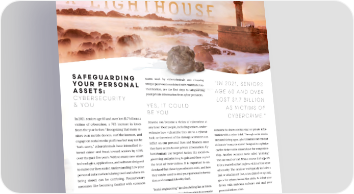 FOR AFOR A SEARCHINGSEARCHING FOR A LIGHTHOU LIGHTHOUSESE SEARCHING LIGHTHOUSE SAFEGUARDING scams used by cybercriminals and choosing “IN 2021, SENIORS YOUR PERSONAL unique passwords combined with multifactor au- thentication, are the first steps to safeguarding AGE 60 AND OVER ASSETS: your private information from cyber predators. CYBERSECURITY LOST $1.7 BILLION & YOU YES, IT COULD AS VICTIMS OF BE YOU CYBERCRIME.” In 2021, seniors age 60 and over lost $1.7 billion as victims of cybercrime, a 74% increase in losses Anyone can become a victim of cybercrime at 1 any time! Most people, including seniors, under- from the year before. Recognizing that many se- someone to share confidential or private infor- niors own mobile devices, surf the internet, and estimate how vulnerable they are to a cyberat- tack, or the extent of the damage scammers can mation with a cyber thief. Through social media engage on social media platforms but may not be sites and dating apps, cybercriminals can conduct “tech-savvy,” cybercriminals have intensified in- inflict on our personal lives and finances once they have access to our private information. Cy- elaborate “romance scams” designed to capitalize ternet crime and fraud toward seniors by 400% on the desire some seniors have for companion- over the past five years. With so many new smart bercriminals use targeted tactics like social en- gineering and phishing to gain and then exploit ship. Another common tactic called “phishing” technologies, applications, and software designed uses an email or text, from a source that appears to make our lives easier, understanding how your the trust of their victims. It is important to un- derstand that these types of scams exist, and how to be a trusted contact to give a victim a false sense personal information is being used and where it's of security. The email or text typically includes a being stored can be confusing. Precautionary they can be used to steal your personal informa- tion and commit identity theft. link or attachment that, once clicked or opened, measures like becoming familiar with common gives the cybercriminal the ability to infect your “Social engineering” involves telling lies or inten- device with malicious software and steal your 1 FBI: Elder Fraud Report https://www.ic3.gov/Media/PDF/ tionally misrepresenting information to persuade personal information. AnnualReport/2021_IC3ElderFraudReport.pdf. 11