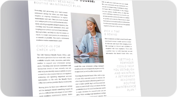 NAVIGATING THE WAY STAYING THE CHARTED COURSE: tells us and your loved ones how you would A RETIREMENT READINESS like your retirement savings distributed once ROUTINE MAINTENANCE PLAN you are no longer living. Notifying the Bene- fit Funds Office immediately of any changes to your address, marital status, or other life events will help us distribute any benefits you Protecting and preserving your hard-earned or your survivors and beneficiaries are entitled retirement savings for when you need them to quickly and accurately. Please keep in mind requires an ongoing commitment to regular that your account and beneficiary information maintenance and care. Once you have charted is maintained separately, and must be updated your unique path to financial freedom in retire- separately, for each of the Funds. ment, selecting waypoints along the journey, like checking your financial statements often and PICK A TIME keeping your survivor and beneficiary informa- tion up to date, can help you stay the course, or & REMIND adjust, to ensure your journey to retirement is as smooth as possible. You need a retirement Most employees use their annual benefit open readiness routine maintenance plan! enrollment season to make updates to bene- fit elections and report life-changing events CHECK-IN FOR like marriage (or divorce) and childbirth (or adoption) with their employers. This is also CHECK-UPS a perfect time to verify important account information the Benefit Funds Office uses, The IAM National Benefit Funds Office, and the service providers that we work with, make "SETTING A available valuable tools, resources, and infor- mation to support your retirement savings REMINDER goals. Checking your account statements and would like your retirement savings managed COULD HELP transaction details at least annually can not should you become temporarily or permanently only help you identify unusual activity on your incapacitated, as well as after you pass away. YOU ESTABLISH account but also ensures that you are regularly AND MAINTAIN reviewing and updating important account Providing the Benefit Funds Office with a copy A RETIREMENT information on file with the Benefit Funds of your fully executed power of attorney (or Office (or a service provider that we work with). other legal document authorizing another per- READINESS son to make specific legal and financial deci- Making plans for how your retirement savings sions on your behalf) helps us to know who has ROUTINE will be managed should something happen to permission to act for you if you become unable MAINTENANCE you is a difficult but critical part of your retire- to make decisions for yourself while you are PLAN." ment readiness maintenance routine. Retire- alive. While naming your beneficiary or ben- ment readiness includes identifying how you eficiaries is a straightforward process that 08 JOURNEY TO RETIREMENT OCTOBER 2022