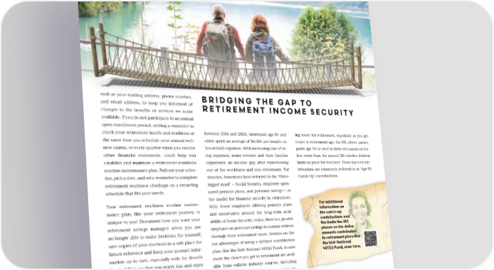 such as your mailing address, phone number, BRIDGING THE GAP TO and email address, to keep you informed of RETIREMENT INCOME SECURITY changes to the benefits or services we make available. If you do not participate in an annual open enrollment period, setting a reminder to check your retirement health and readiness at Between 2016 and 2020, Americans age 65 and ing more for retirement, especially as you get the same time you schedule your annual well- older spent an average of $4,066 per month on closer to retirement age, the IRS allows partici- ness exams, or every quarter when you receive household expenses. With increasing cost of liv- pants age 50 or over to defer thousands of dol- other financial statements, could help you ing expenses, many retirees and their families lars more than the annual IRS elective deferral establish and maintain a retirement readiness experience an income gap after transitioning limits in place for that year. These types of con- routine maintenance plan. Pull out your calen- out of the workforce and into retirement. For tributions are commonly referred to as “Age 50 dar, pick a date, and set a reminder to complete decades, Americans have referred to the “three- Catch-Up” contributions. retirement readiness checkups on a recurring legged stool” — Social Security, employer-spon- schedule that fits your needs. sored pension plans, and personal savings — as the model for financial security in retirement. Your retirement readiness routine mainte- With fewer employers offering pension plans For additional nance plan, like your retirement journey, is and uncertainty around the long-term avail- information on unique to you! Document how you want your the catch-up ability of Social Security, today, there is a greater contributions and retirement savings managed when you are emphasis on personal savings to sustain retirees the limits the IRS no longer able to make decisions for yourself; places on the dollar through their retirement years. Articles on the amounts contributed save copies of your elections in a safe place for tax advantages of using a defined contribution to retirement plans like future reference and keep your account infor- plan, like the IAM National 401(k) Fund, to save the IAM National mation up to date, especially with the Benefit 401(k) Fund, scan here. more the closer you get to retirement are avail- Funds Office, so that you worry less and enjoy able from reliable industry sources, including retirement more! the Internal Revenue Service. To encourage sav- 09