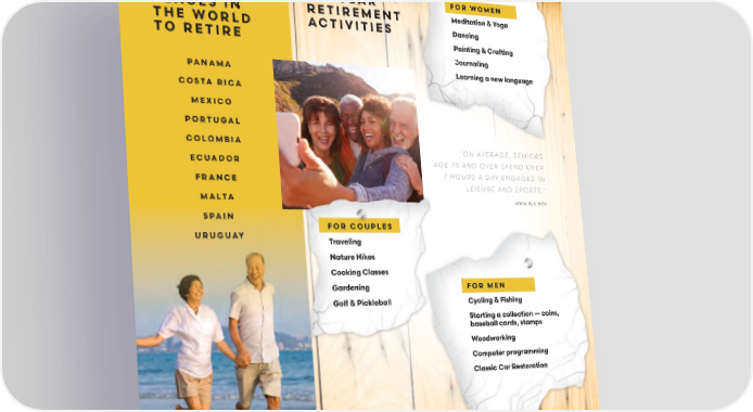 TOP 10 BEST POPULAR FOR WOMEN PLACES IN RETIREMENT Meditation & Yoga THE WORLD ACTIVITIES Dancing TO RETIRE Painting & Crafting Journaling PANAMA Learning a new language COSTA RICA MEXICO PORTUGAL COLOMBIA βON AVERAGE, SENIORS ECUADOR AGE 75 AND OVER SPEND OVER FRANCE 7 HOURS A DAY ENGAGED IN LEISURE AND SPORTS.β MALTA WWW.BLS.GOV SPAIN FOR COUPLES URUGUAY Traveling Nature Hikes Cooking Classes Gardening FOR MEN Golf & Pickleball Cycling & Fishing Starting a collection β coins, baseball cards, stamps Woodworking Computer programming Classic Car Restoration 15