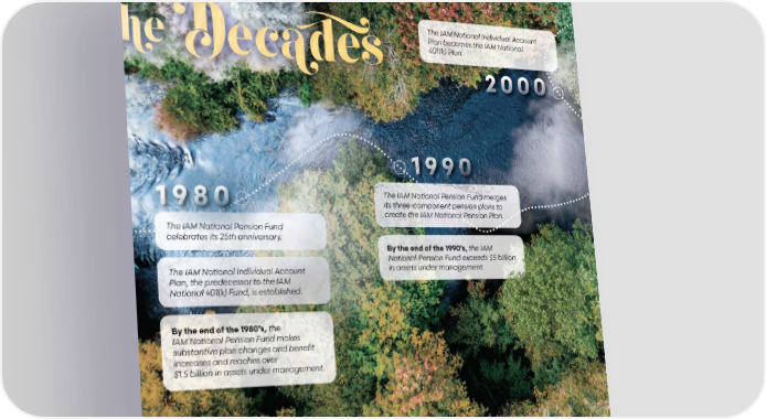 he !AM Labor Mana he /AM Nati und is established. Ian become 01(k) Plan. he !AM National He Ian is established. By the end of the 1960's, the !AM Labor Management Pension Fund has around 2,500 retirees and $40 million in assets under management. The !AM National Pension Fund merges its three-component pension plans to create the !AM National Pension Plan. tPe Labor Mana Fund fficially named the /AM sary. und. By the end of the 1990's, the /AM National Pension Fund exceeds $5 billion in assets under management. I Account M Nationa !AM National Health and W e /AM the predec n becomes the National /AM blished. no! 401(k) F st Fund. By the end of the 1980's, the By the end of the 1970's, the !AM National Pension Fund makes !AM National Pension Fund has substantive plan changes and benefit approximately 20,000 retirees and increases and reaches over over $300 million in assets under $1.5 billion in assets under management. management.